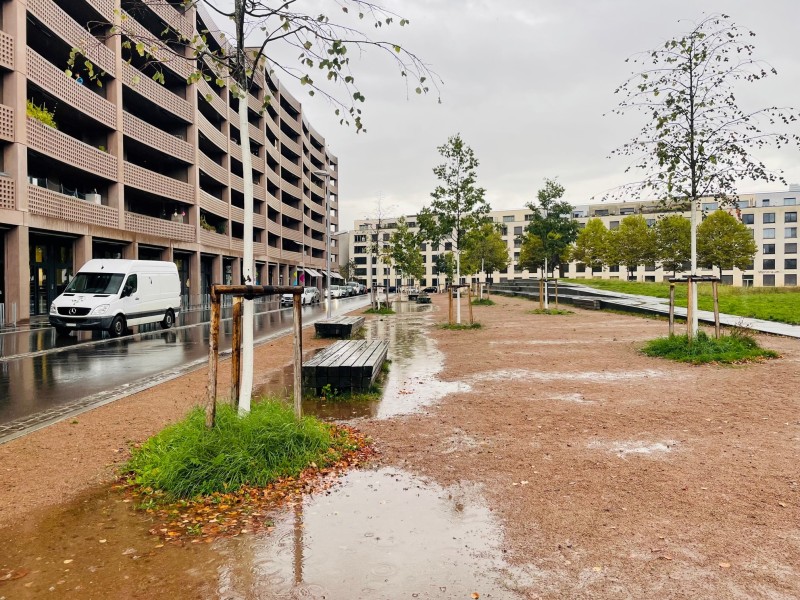 Tuttavia, il potenziale c'è: marciapiedi, piste ciclabili e parcheggi possono essere progettati per consentire l'infiltrazione, così come le aree ricreative come il quartiere di Erlenmatt. Lo spazio per le radici è fondamentale per la vitalità degli alberi. Gli alberi urbani spesso sopravvivono solo per circa 30 anni a causa dello spazio limitato e dello stress da calore e siccità. Nuovi substrati portanti e allo stesso tempo permeabili, come quelli attualmente in fase di sperimentazione in diverse città, consentono di ampliare lo spazio per le radici sotto i parcheggi, i marciapiedi e le carreggiate.